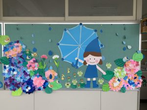 読書室の前に、きれいなあじさいの花が咲きました。まだ6月になっていないのに、今年は早い梅雨入りです。雨の日には思いっきり外で遊ぶことはできませんが、そんなときこそ、たくさんの本を読みましょう。雨の季節にぴったりの本があるかもしれません。きれいなあじさいの花を咲かせてくれたのは、学校支援ボランティアのみなさんです。いつもありがとうございます。