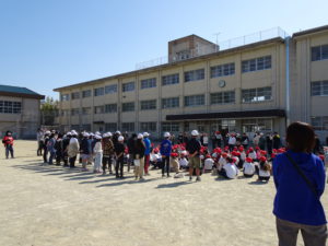 最初、縦割り班である「第二っ子班」で集まり全校児童が