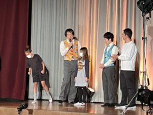 ライセンスの都合上詳しくは紹介できませんが、とても楽しかったです。子どもたちの反応もよく、演者のみなさんとコミュニケーションをとりながら楽しんでいました。途中代表の方が何度も口にしていたのが「想像力」という言葉です。今日の演目を見るのも「想像力」を働かせることが大事です。想像力豊かな子どもたちであってほしいと思います。体験コーナーでは5年生と2年生のお友だちがステージに上がり、銅像になっていました。お見事でした。そして6年生の担任の先生もステージ上に…。先生の迷演(?)に子どもたちも大喜びでした。最後に人権児童会から、全校児童を代表して手作りの花かごを贈りました。今回すてきなパフォーマンスで子どもたちを楽しませてくれた『カンジヤマ・マイム』のみなさんは、文化庁の要請を受け日本全国の学校で公演を行われています。次は沖縄県の宜野湾市へ行かれるそうです。『カンジヤマ・マイム』のみなさん、楽しい時間をありがとうございました。