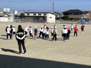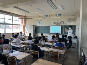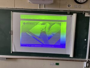 3年生は算数でコンパスの使い方を学習していました。ホワイトボードに映し出された動画に合わせて、先生がていねいに説明していきます。みんなコンパスを使って初めて描いた半径3cmの円、忘れないでほしいです。