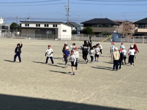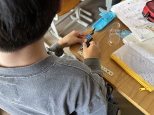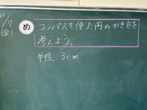3年生は算数でコンパスの使い方を学習していました。ホワイトボードに映し出された動画に合わせて、先生がていねいに説明していきます。みんなコンパスを使って初めて描いた半径3cmの円、忘れないでほしいです。
