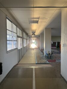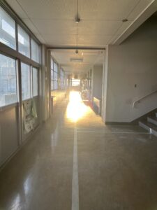 ある朝いつもより少し早く、子どもたちが登校する前に校内を歩いていると、1階教室前廊下がまぶしいくらいに光っていました。季節の関係もあるのでしょうが、体育館に通じる扉のガラスから、ちょうど一直線に朝日の光が長い 廊下に伸びていました。まさに光の道でした。あまりにも清々しくきれいだったので写真を撮りました。でも写真ではなかなか伝わりませんね。