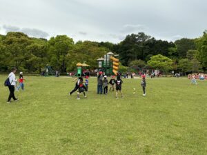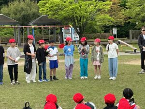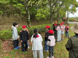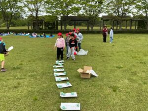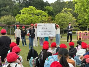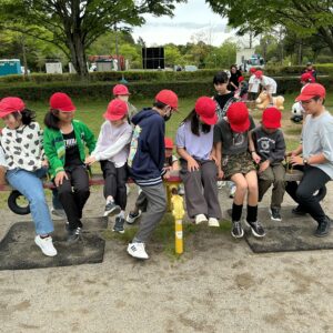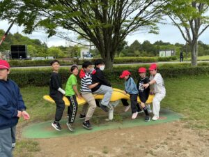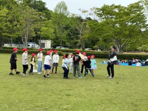 開会式では人権児童会の子どもたちが「安全に過ごし、みんなと仲を深められる遠足にしよう」というめあてを示し、その後、6年生がみんなで楽しめるようにと考えたしっぽ取りやボウリング、宝探し、おにごっこ、バクダンゲーム、リアルすごろくなど、趣向を凝らした遊びをして過ごしています。少し雨が当たる時間帯もありましたが、もろともせず楽しんでいます。